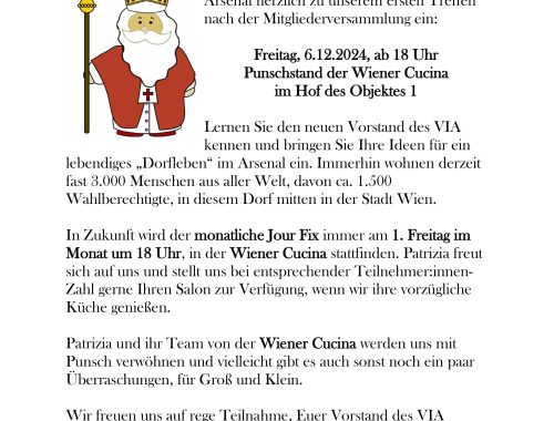 Wir freuen uns auf zahlreiches Erscheinen. Für junge und junggebliebene Arsenalerinnen und Arsenaler hat Patrizia von der Wiener Cucina auch einen alkoholfreien Punsch und noch ein paar andere kleine Überraschungen vorbereitet! Hier die Einladung zum Ausdrucken und Verteilen