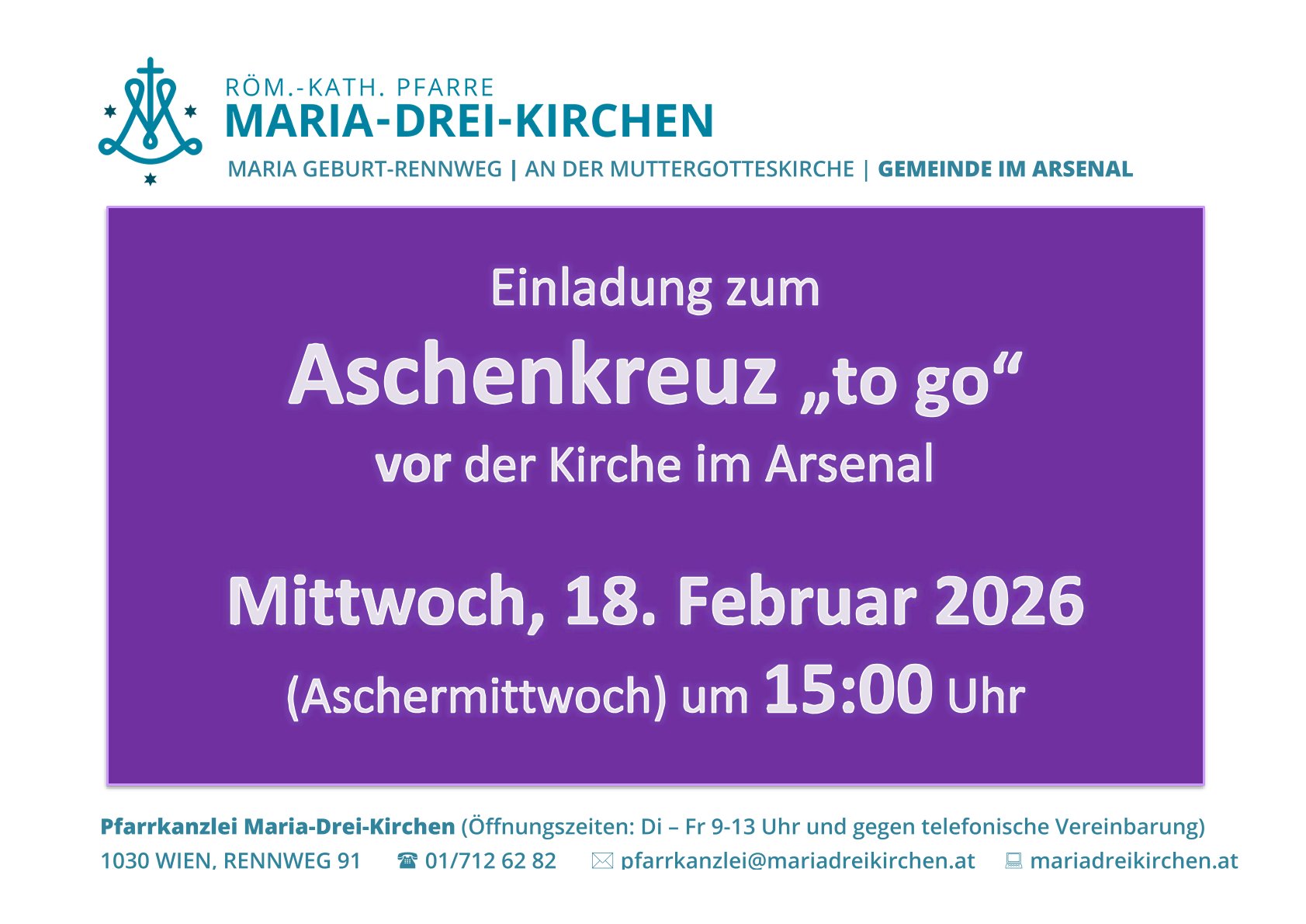 Die Pfarre MARIA-DREI-KIRCHEN – GEMEINDE IM ARSENAL freut sich auf ein Wiedersehen bei der Spende des Aschenkreuzes „to go“!